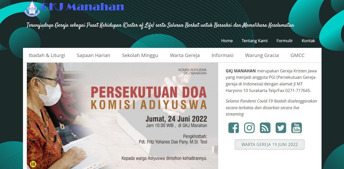Situs informasi pelayanan Gereja Kristen Jawa (GKJ) Manahan Surakarta. Situs yang sering diperbaharui secara berkala ini menyajikan informasi kegiatan gerejawi seperti Ibadah, Sekolah Minggu, dan beragam kegiatan lainnya. Warta Gereja Mingguan juga dapat diakses melalui website ini.